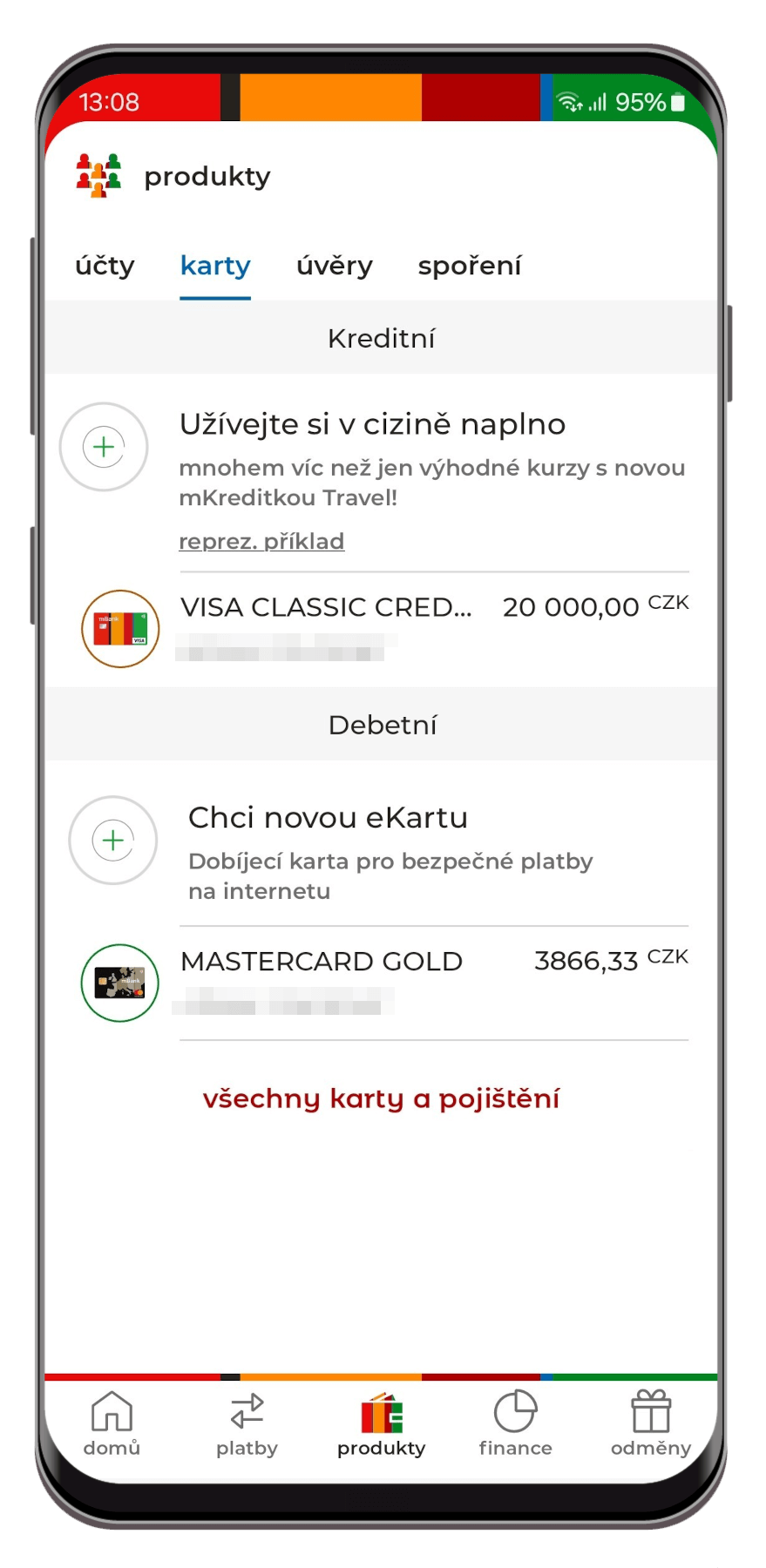1. Klikněte v appce na Produkty a pak na záložku Karty, kde si vyberete, kterou chcete do Google Pay nahrát.