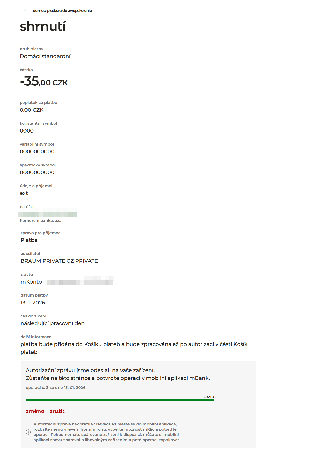 - Následující platební příkazy budete do košíku přidávat bez potvrzování mobilní aplikací nebo SMS kódom.