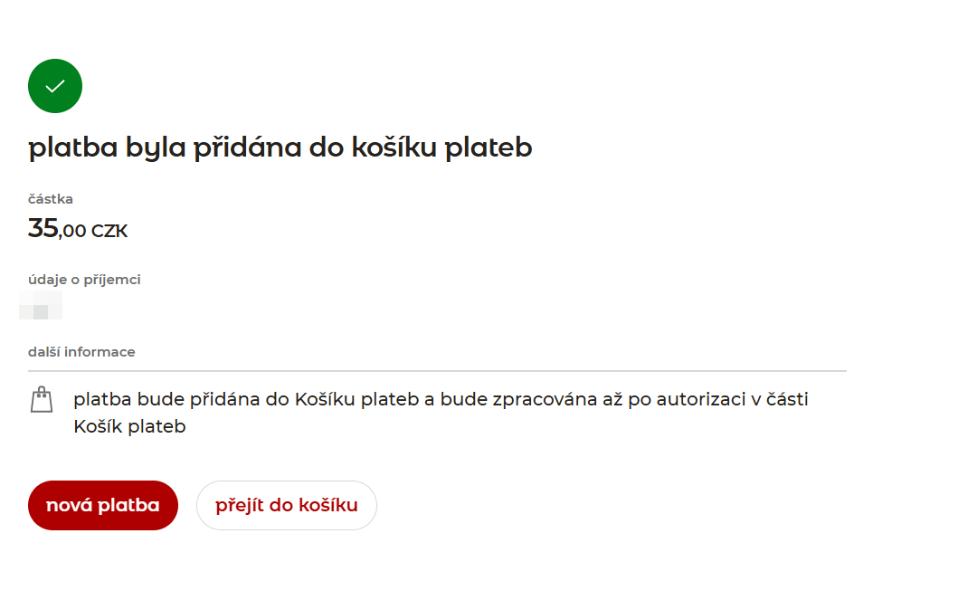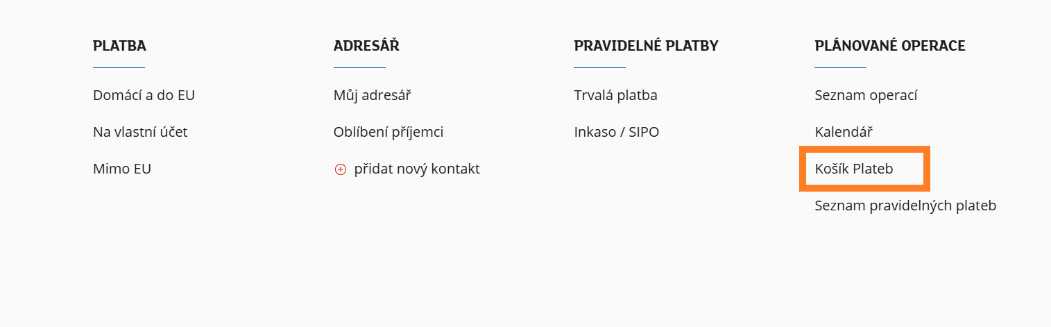 Košík plateb slouží k autorizaci více plateb jedním SMS kódem. Pokud potřebujete najednou poslat více plateb najednou a nechce se Vám platby jednotlivě autorizovat můžete je ukládat do košíku plateb a po ukončení zadávání všechny autorizovat 1 SMS kódem. V případě podnikatelských účtů s aktivovanou víceosobovou autorizací se do košíku plateb uloží platby, které je třeba autorizovat osobou s dostatečným autorizačním limitem.