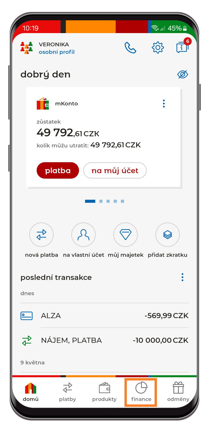 1. Po přihlášení do appky klikněte na Finance v dolní části obrazovky.