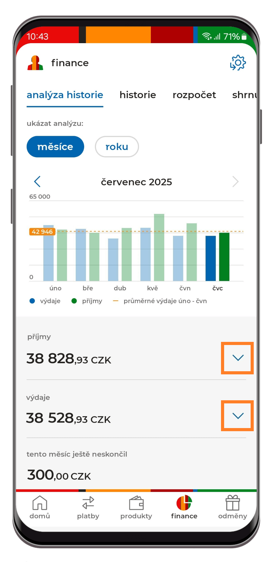 2. Zobrazí se vám přehled příjmů a výdajů v daném měsíci. Pro zobrazení podrobností rozbalte jednu z kategorií.