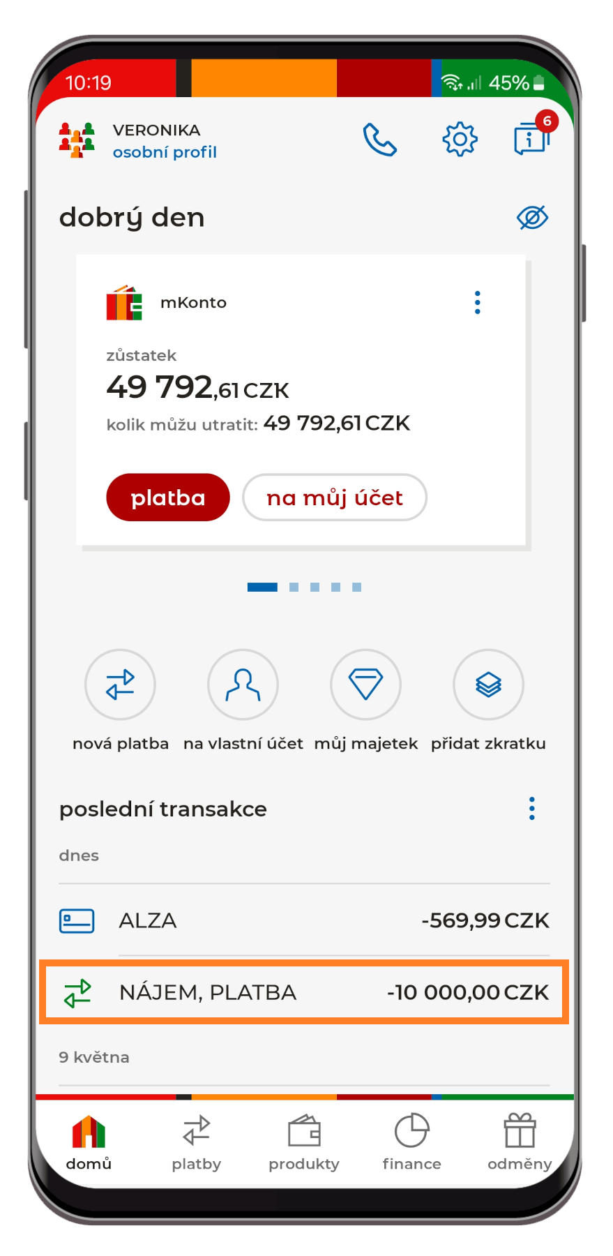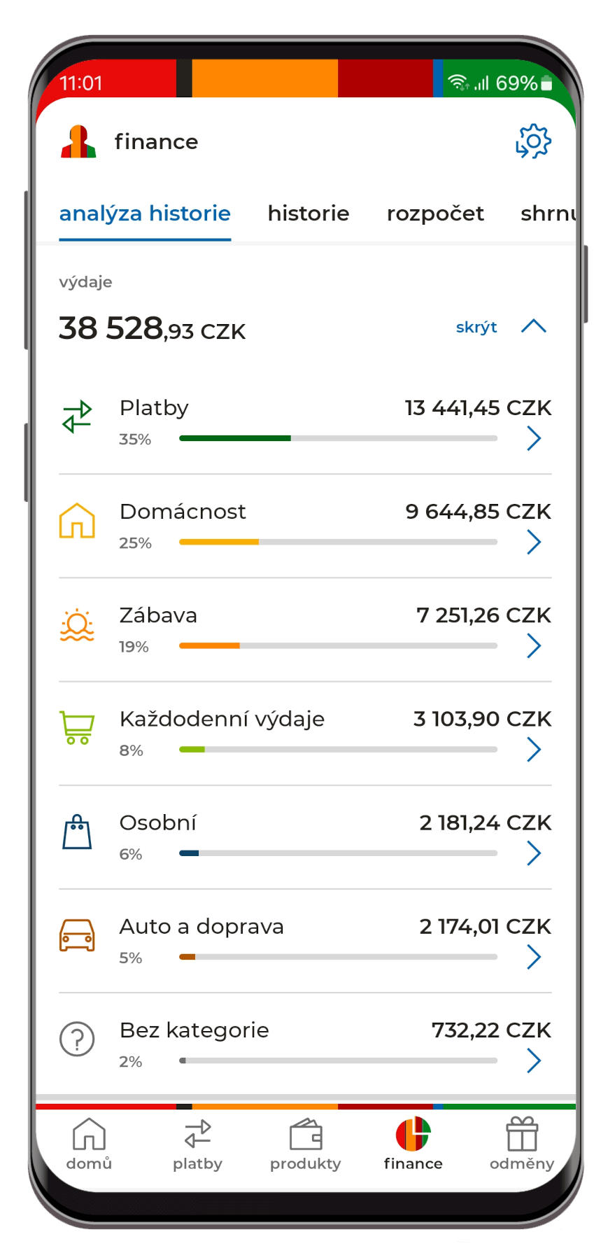 Všechny platby se automaticky rozdělí do kategorií, jako je například Doprava, Domácnost nebo Zábava.